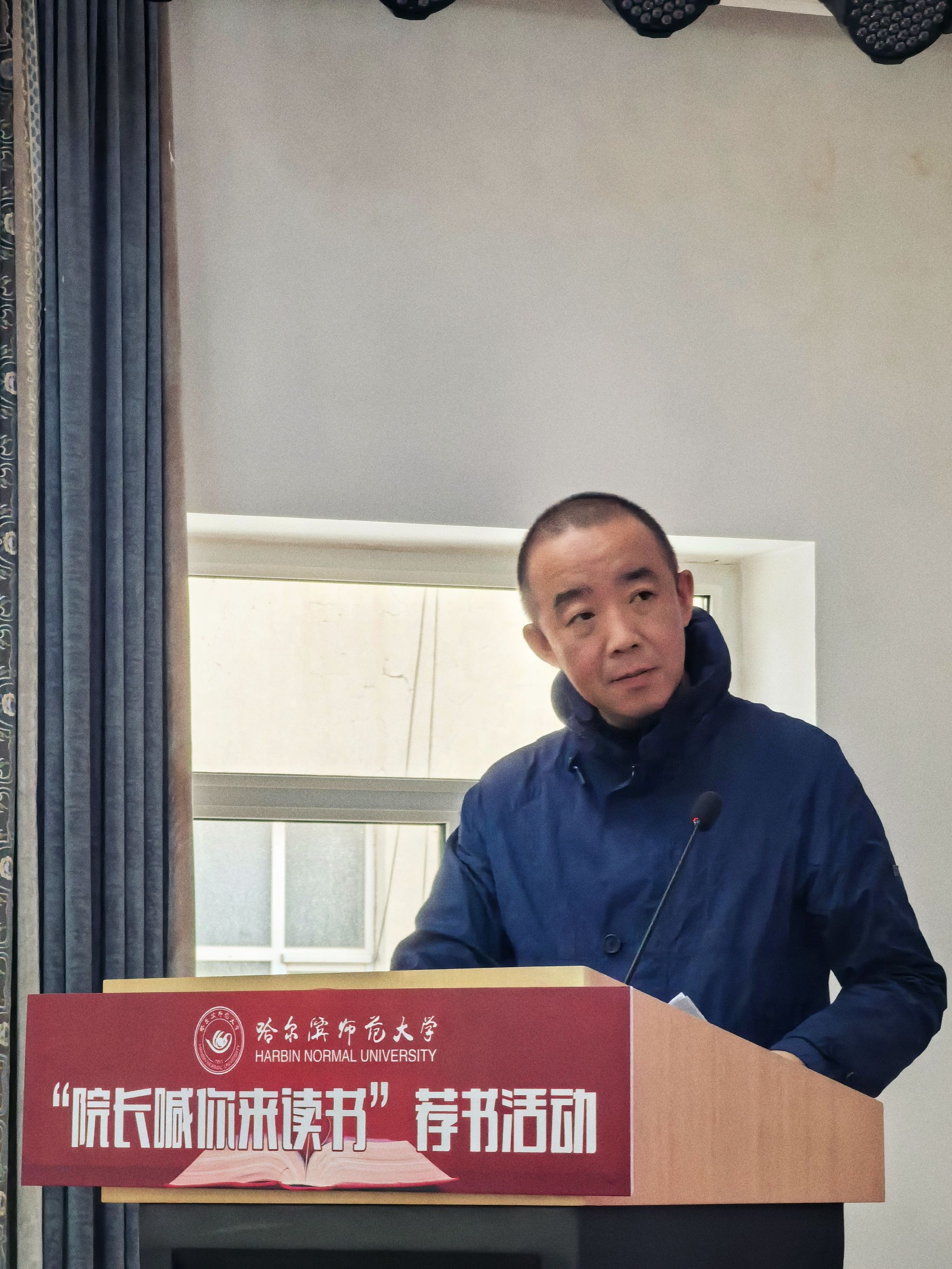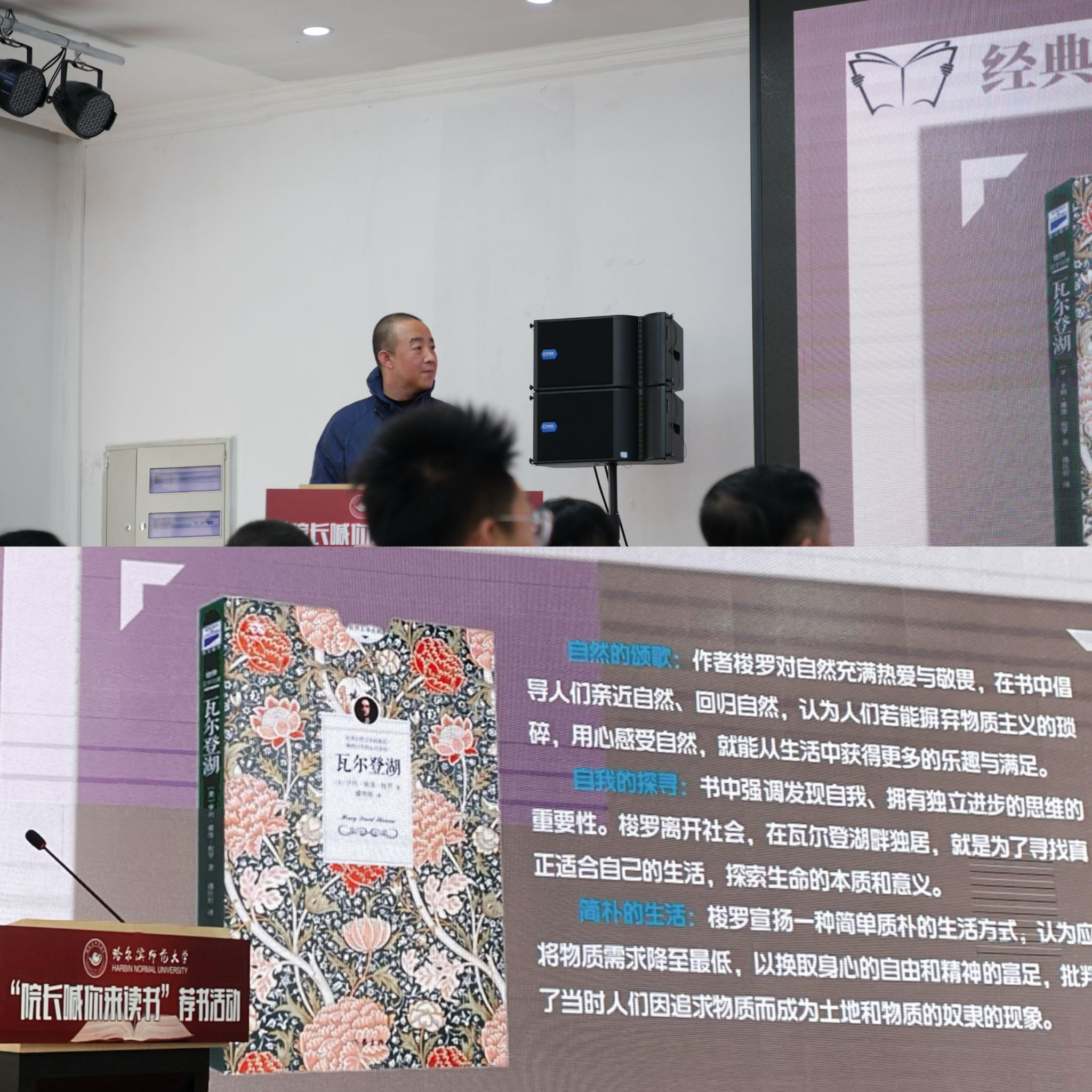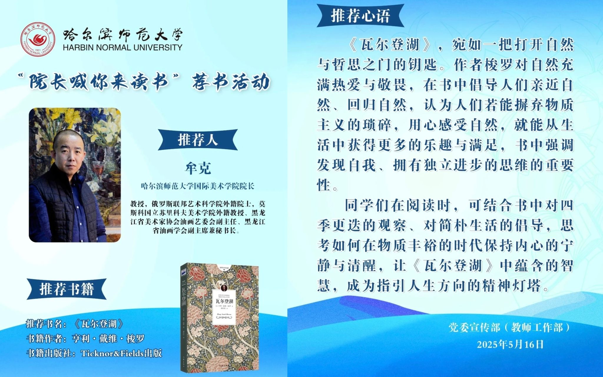阅读筑梦,书香致远,2025年5月16日下午2点,哈尔滨师范大学“院长喊你来读书”第二期荐书活动在留学生三公寓多功能厅成功举办,国际美术学院院长牟克作为“好书推荐官”在现场与各位同学分享美国自然文学作品《瓦尔登湖》。